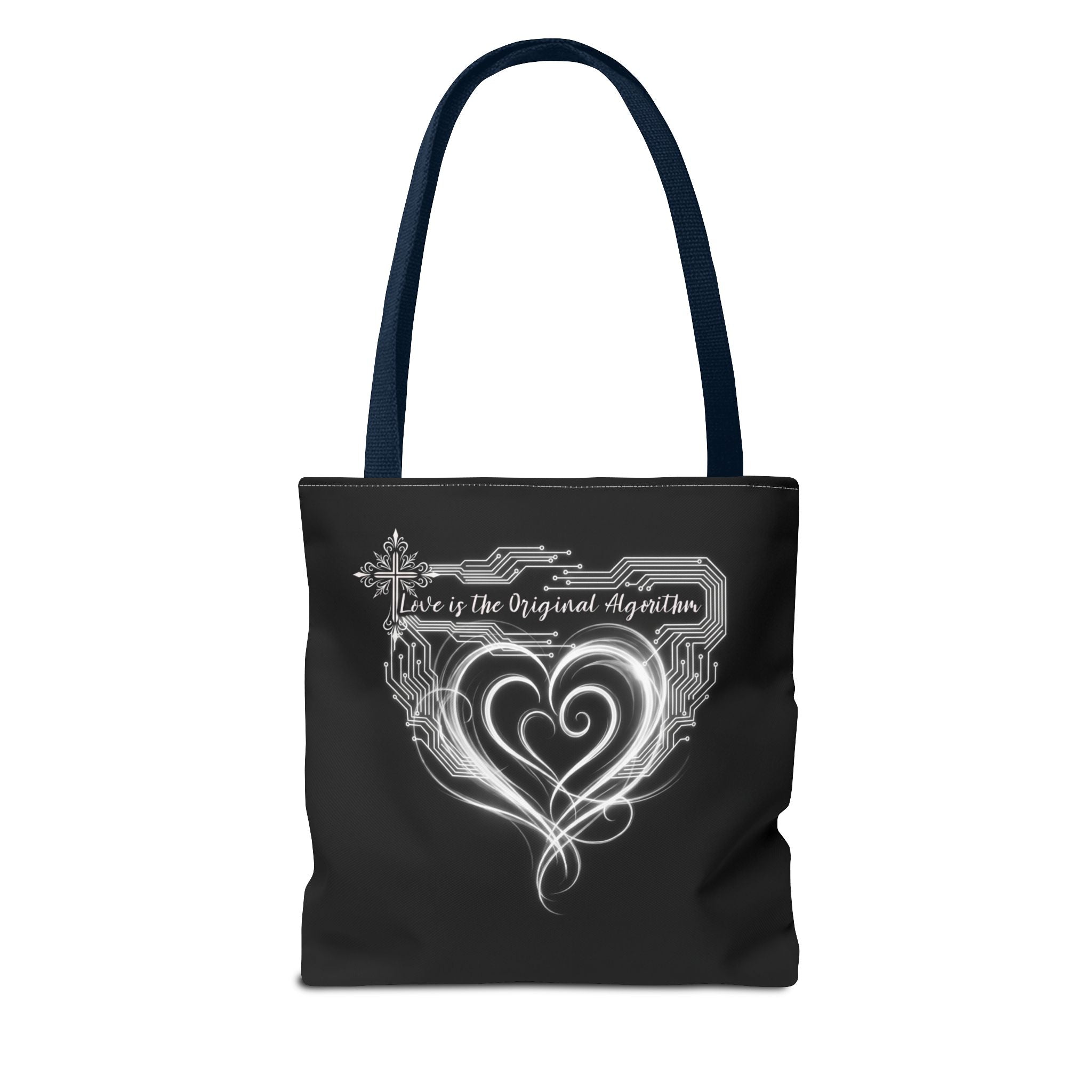 Black Heart Art Tote — "Love is the Original Algorithm" All-Over Print Tote Bag