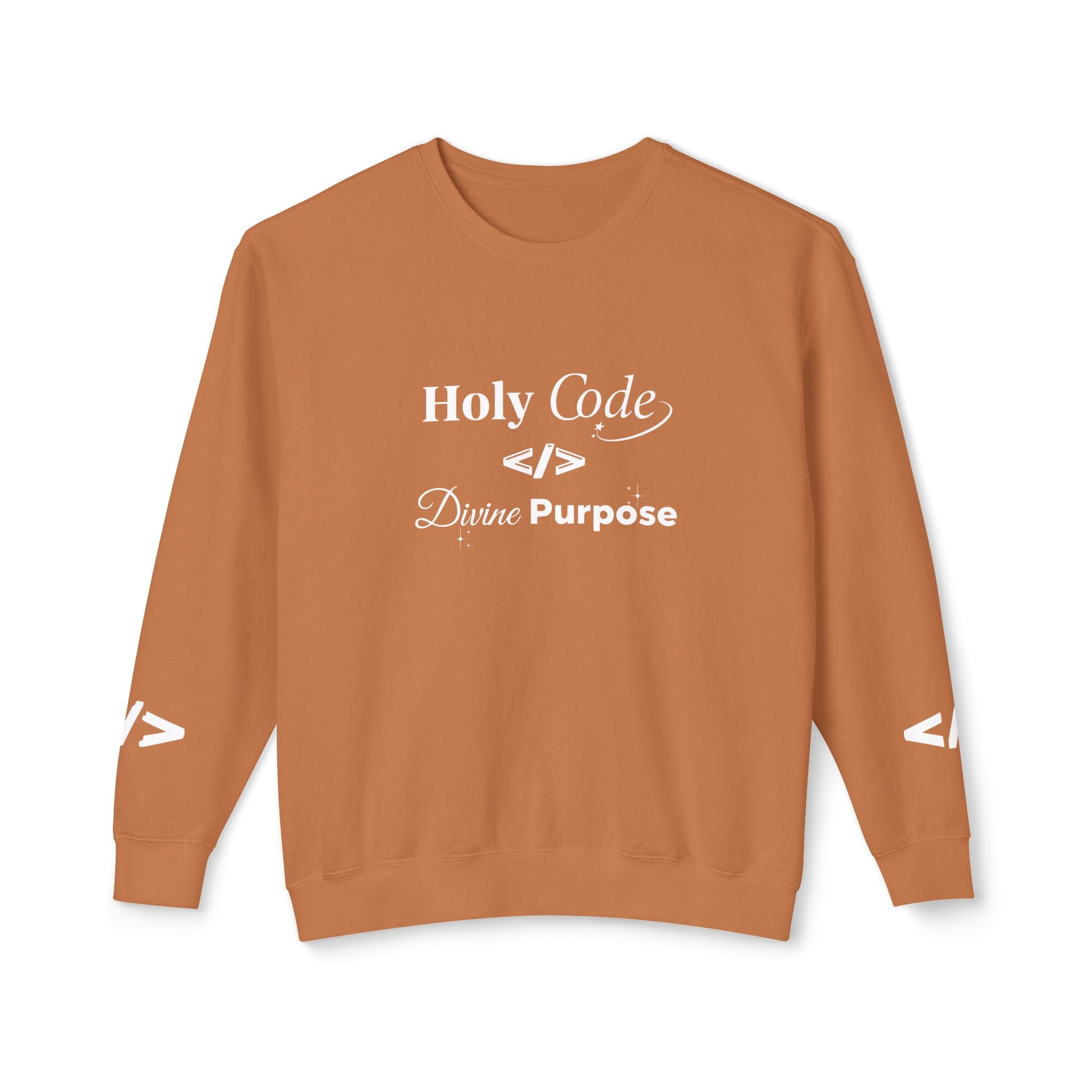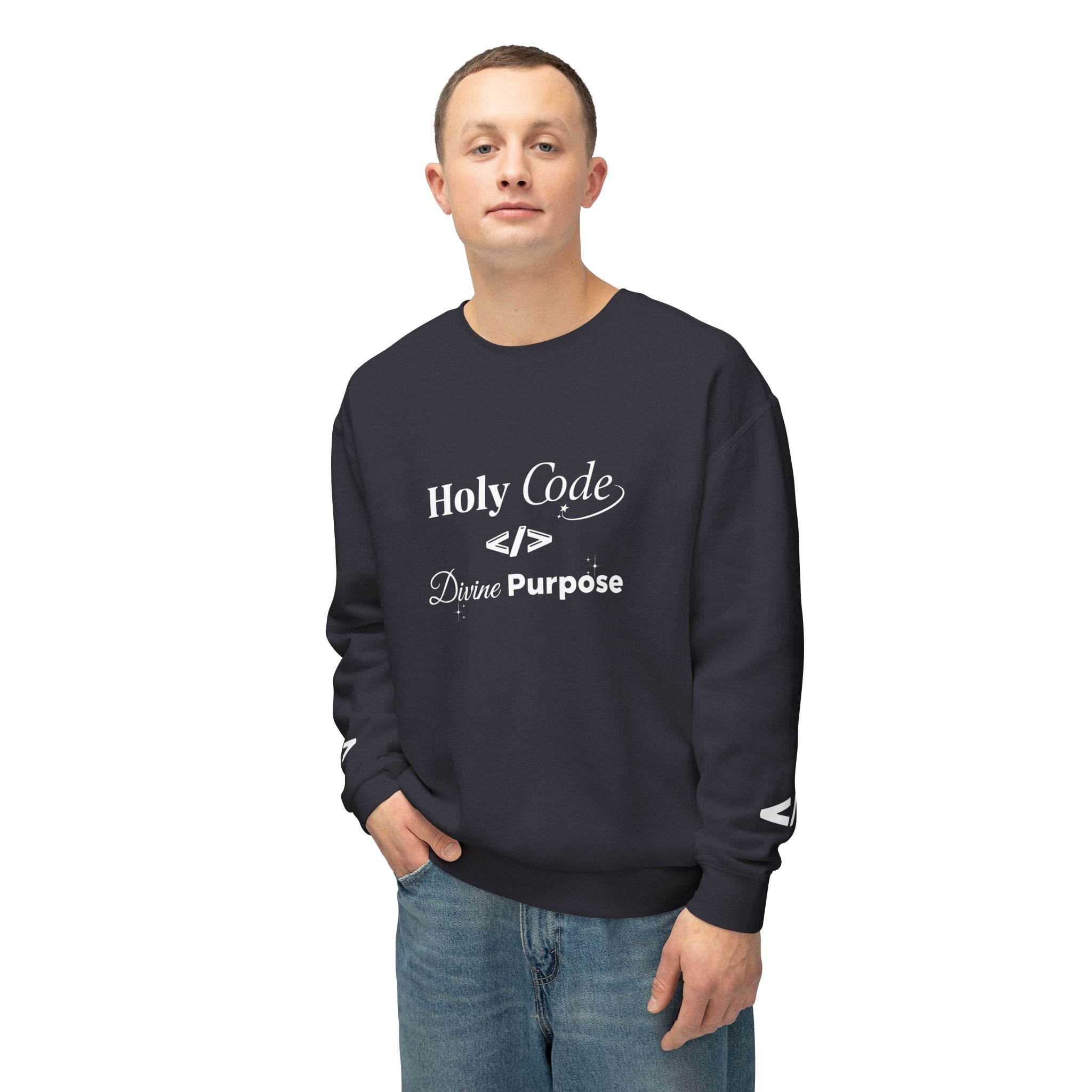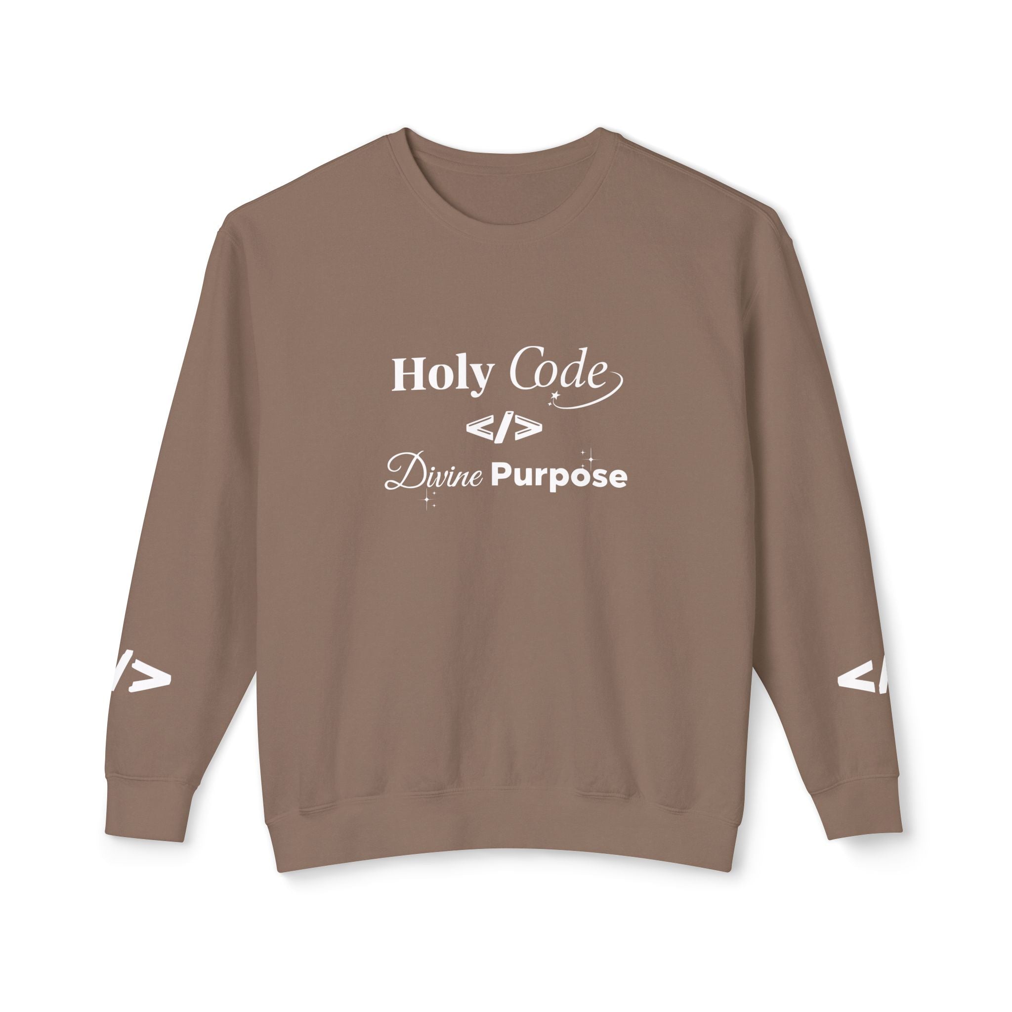 Warm, soft, and quietly clever — this lightweight crewneck speaks to people who live between logic and wonder. The front reads “Holy Code / Divine Purpose” in a mix of serif and script, a gentle nod to faith and craft. A minimalist head-with-code icon rests on the back, while subtle angle-bracket marks appear on each sleeve for an extra coder’s wink. Wear it to late-night debugging sessions, Sunday meetups, or casual coffee runs. The relaxed fit and light fabric make it easy to layer over tees or under jackets, so it becomes a go-to for transitional weather and conversation-starting comfort.