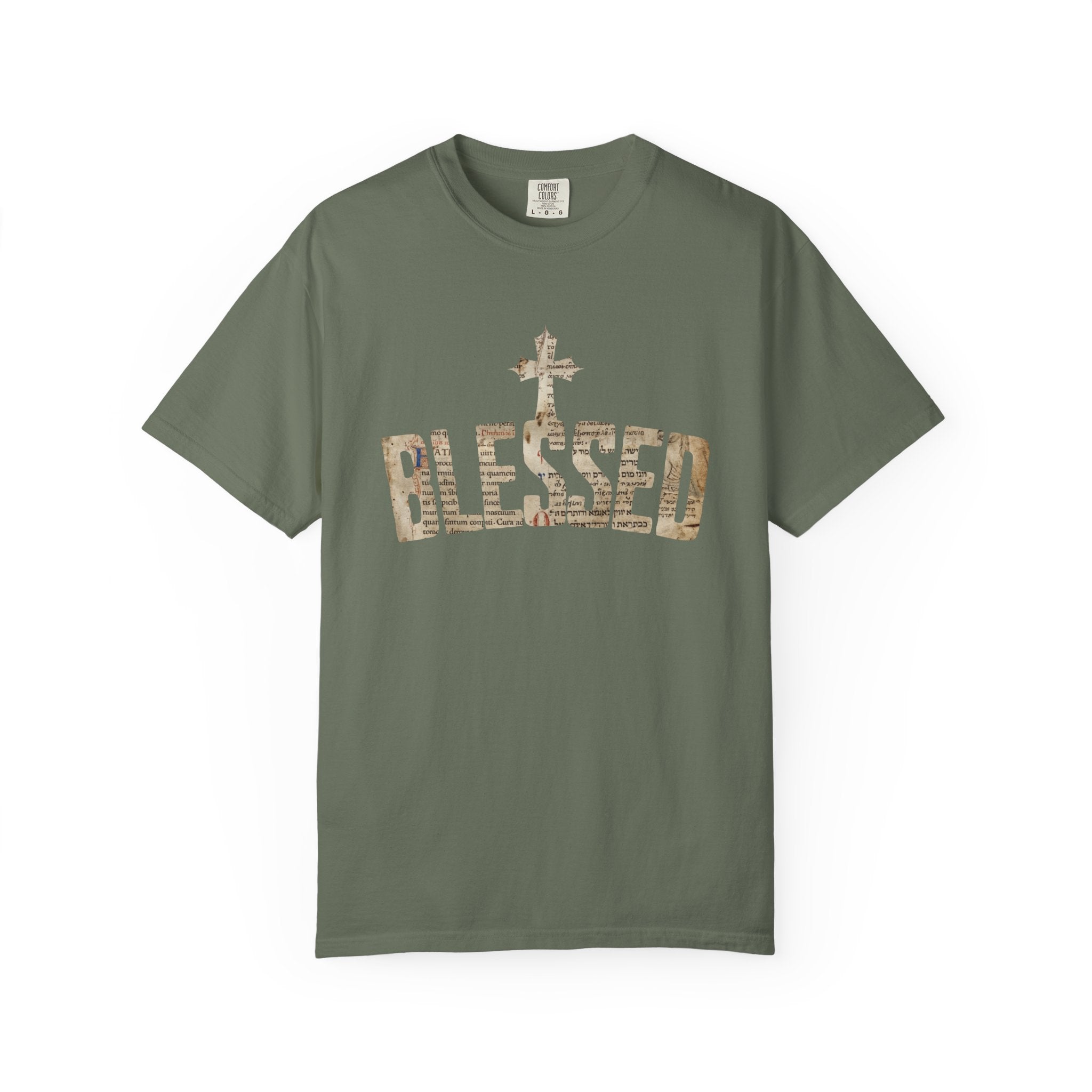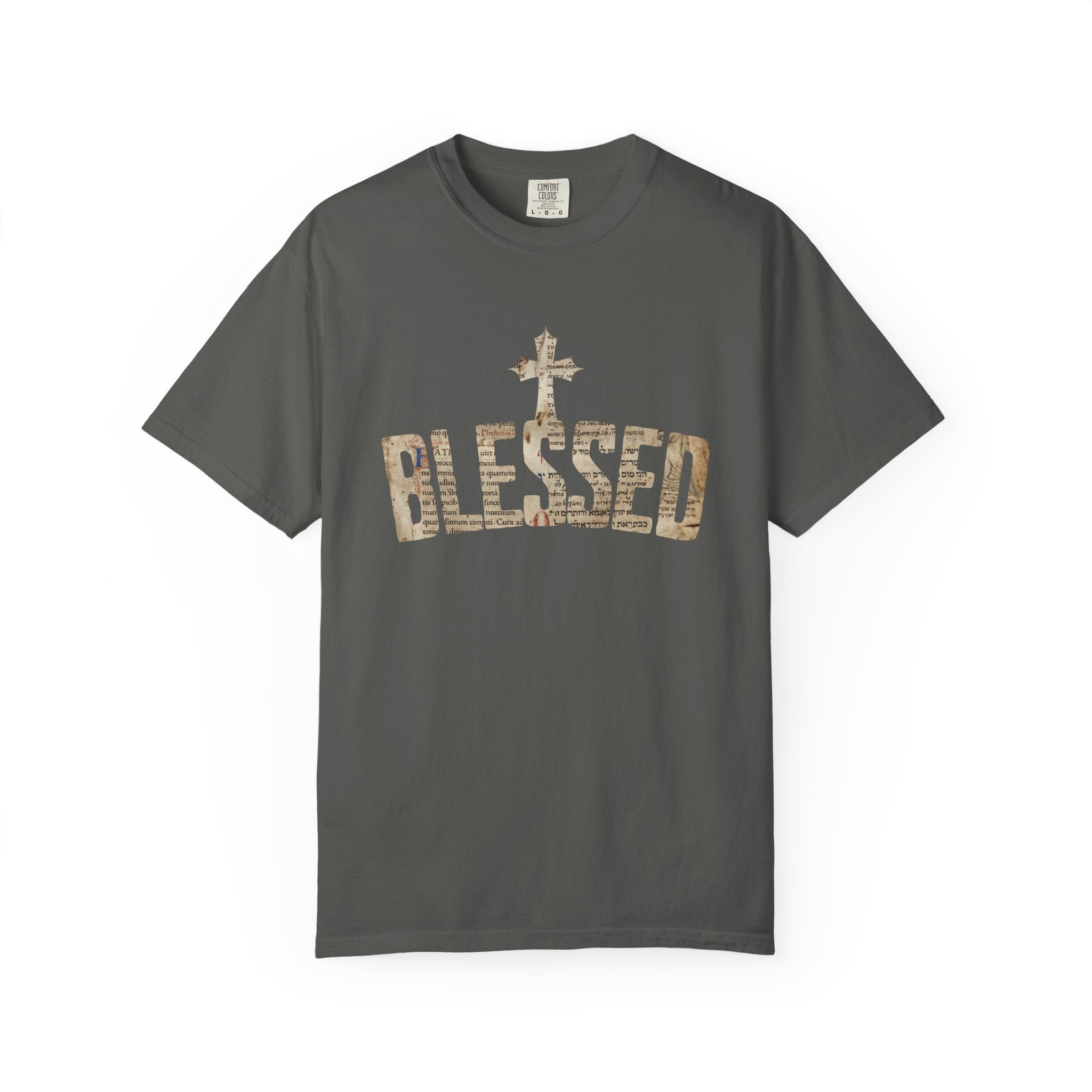 This soft, garment-dyed tee carries a simple, heartfelt message: BLESSED, with a subtle cross motif woven into the letters. The relaxed silhouette and medium-weight 100% ring-spun cotton feel lived-in from the first wear. The muted, vintage-like color and washed texture let the design sit quietly—faith-forward without shouting—so it slips easily into everyday routines: folded on a dresser, layered under a jacket, or worn solo on slow Sundays. It’s made to be reached for when you want a calm, sincere reminder of gratitude.