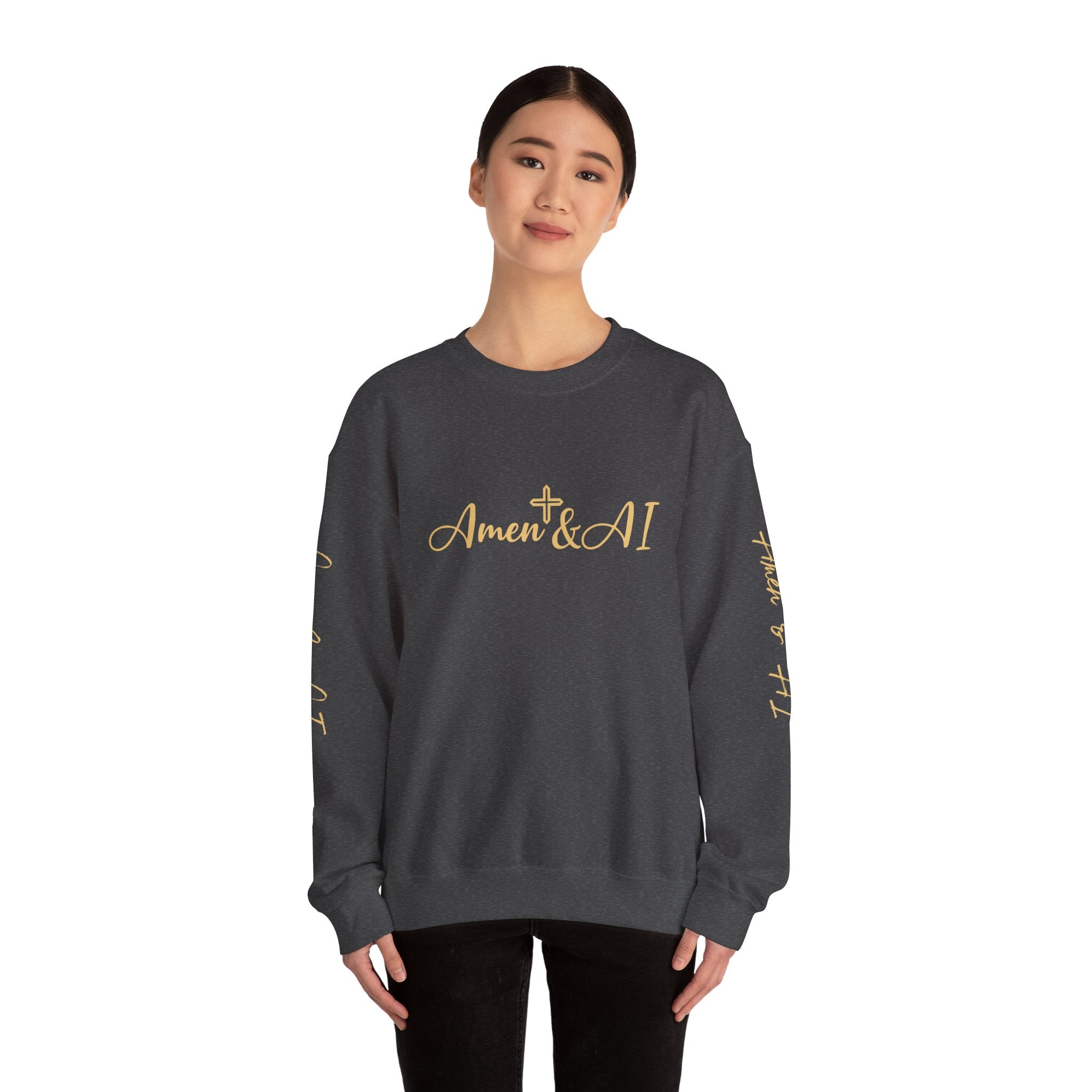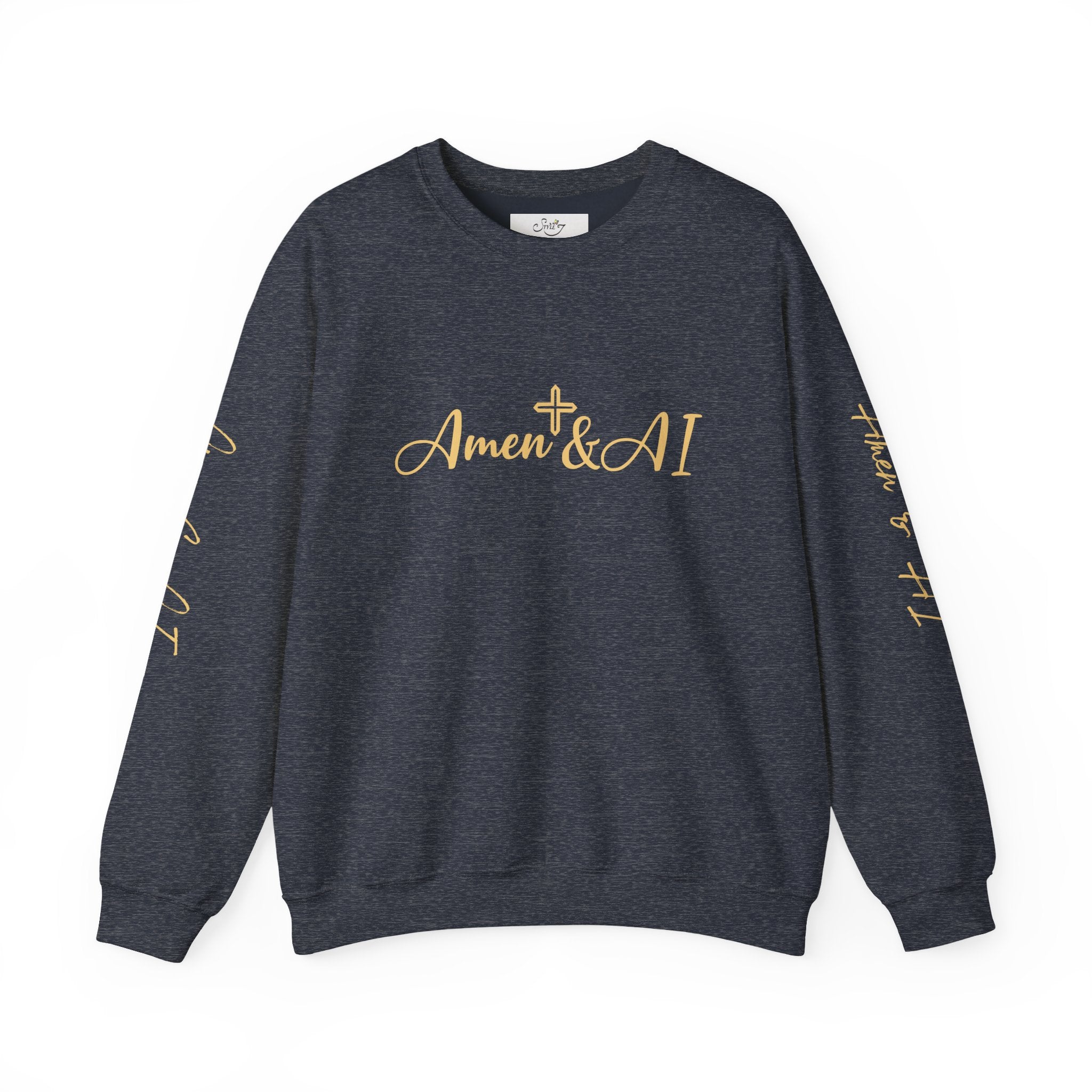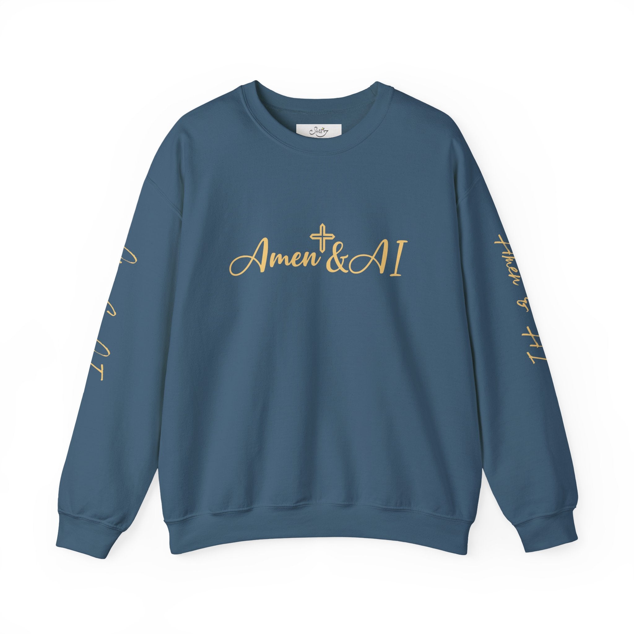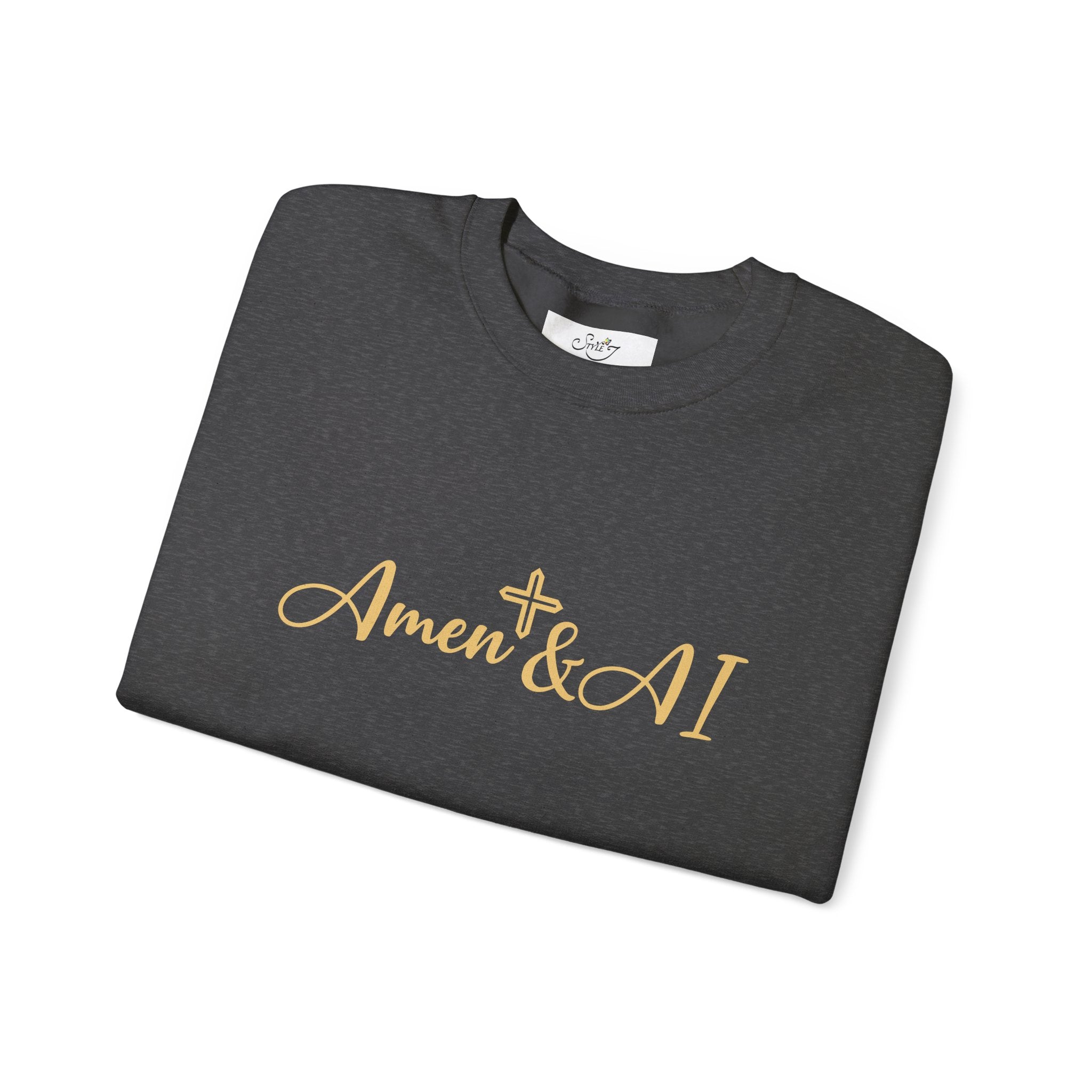 Christian AI Crewneck Sweatshirt - "Amen & AI" Gold Script, "Powered by Prayer, Driven by Data"