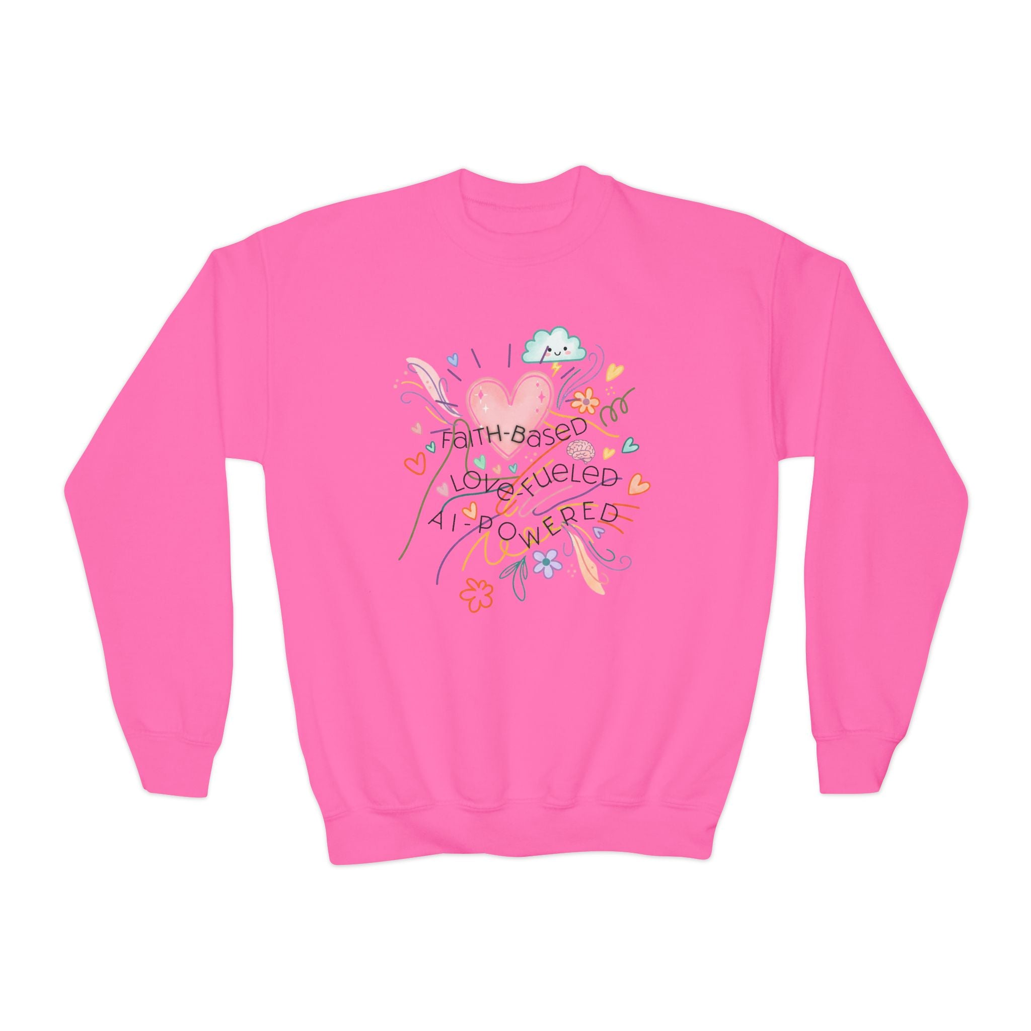 Youth Crewneck Sweatshirt — Cute Heart & Floral "Faith-Based. Love-Fueled. AI-Powered." Design